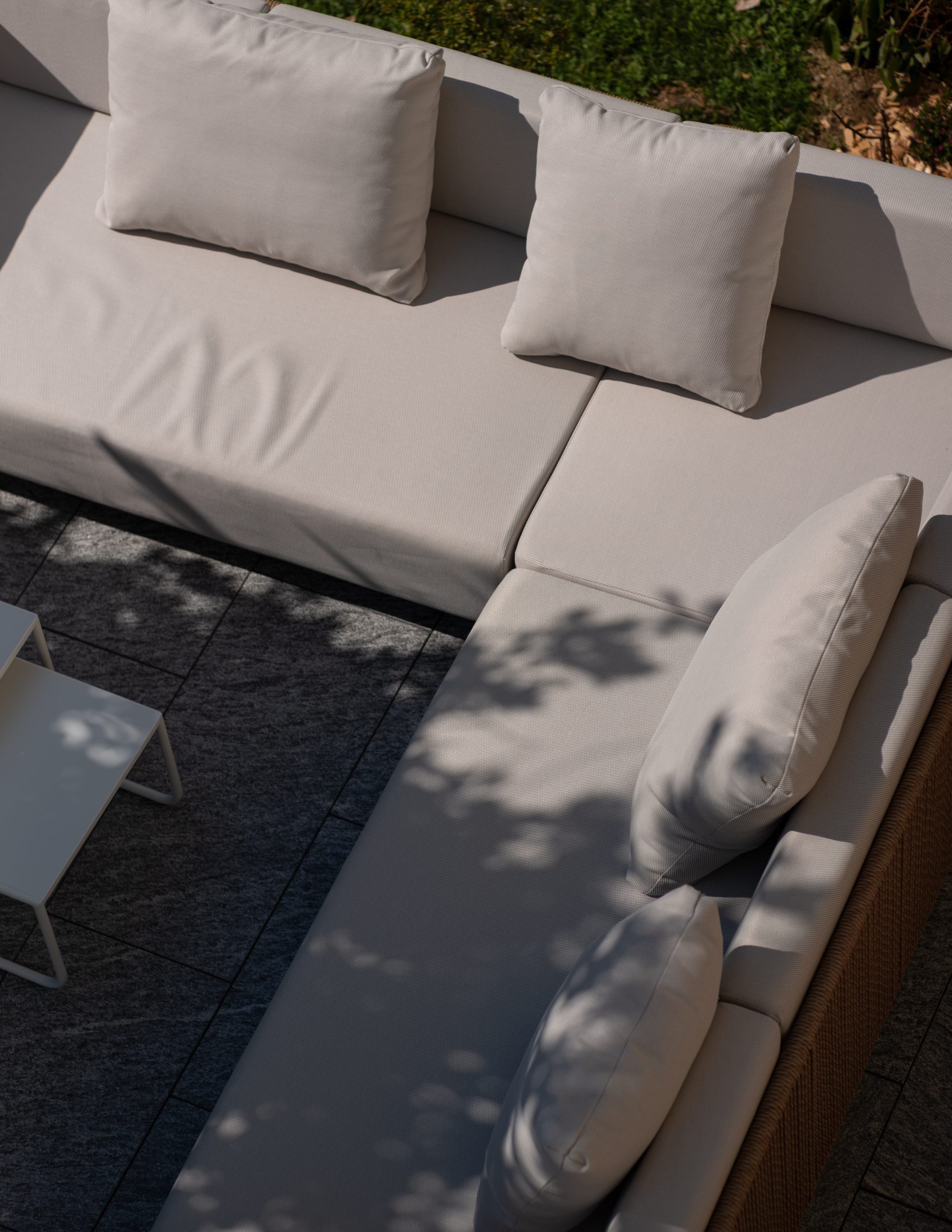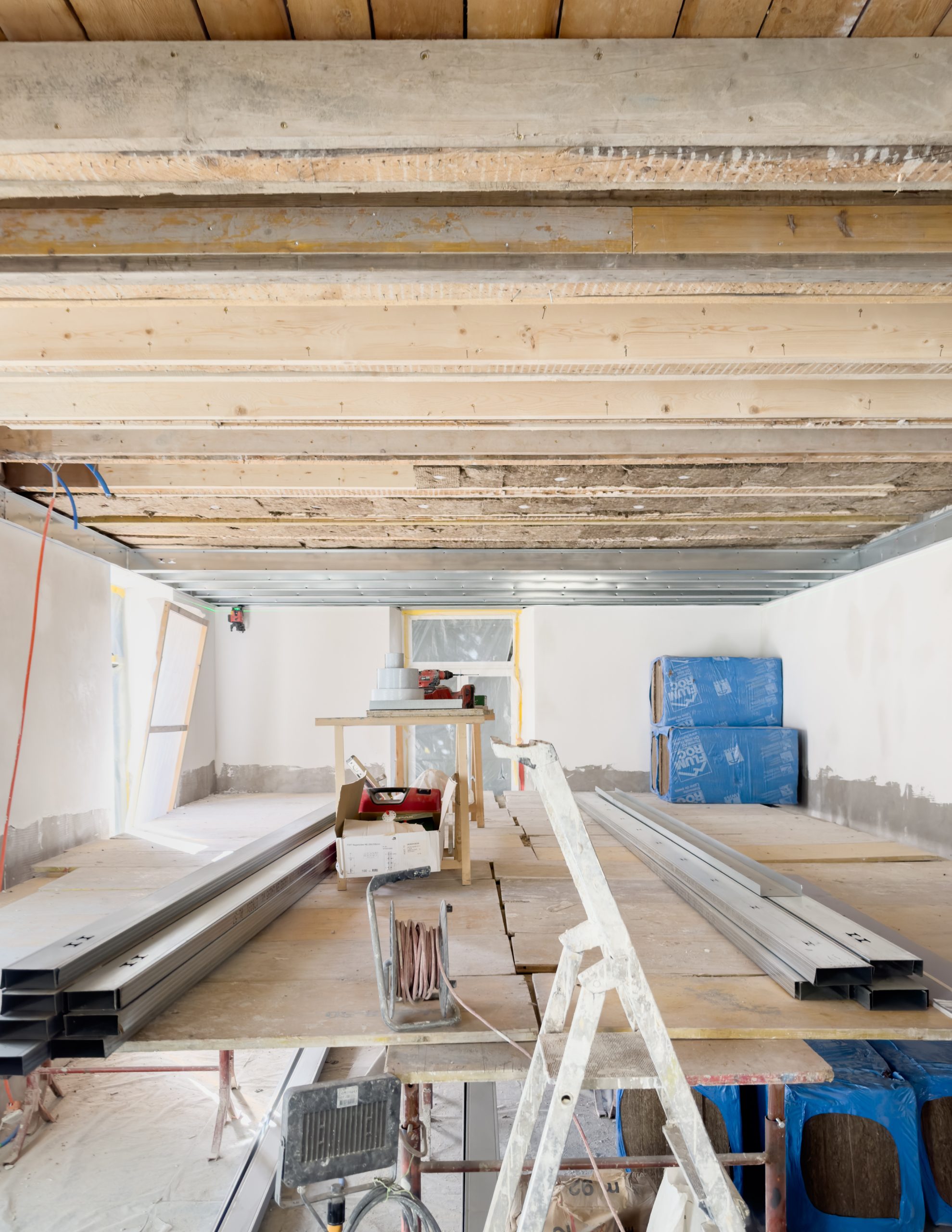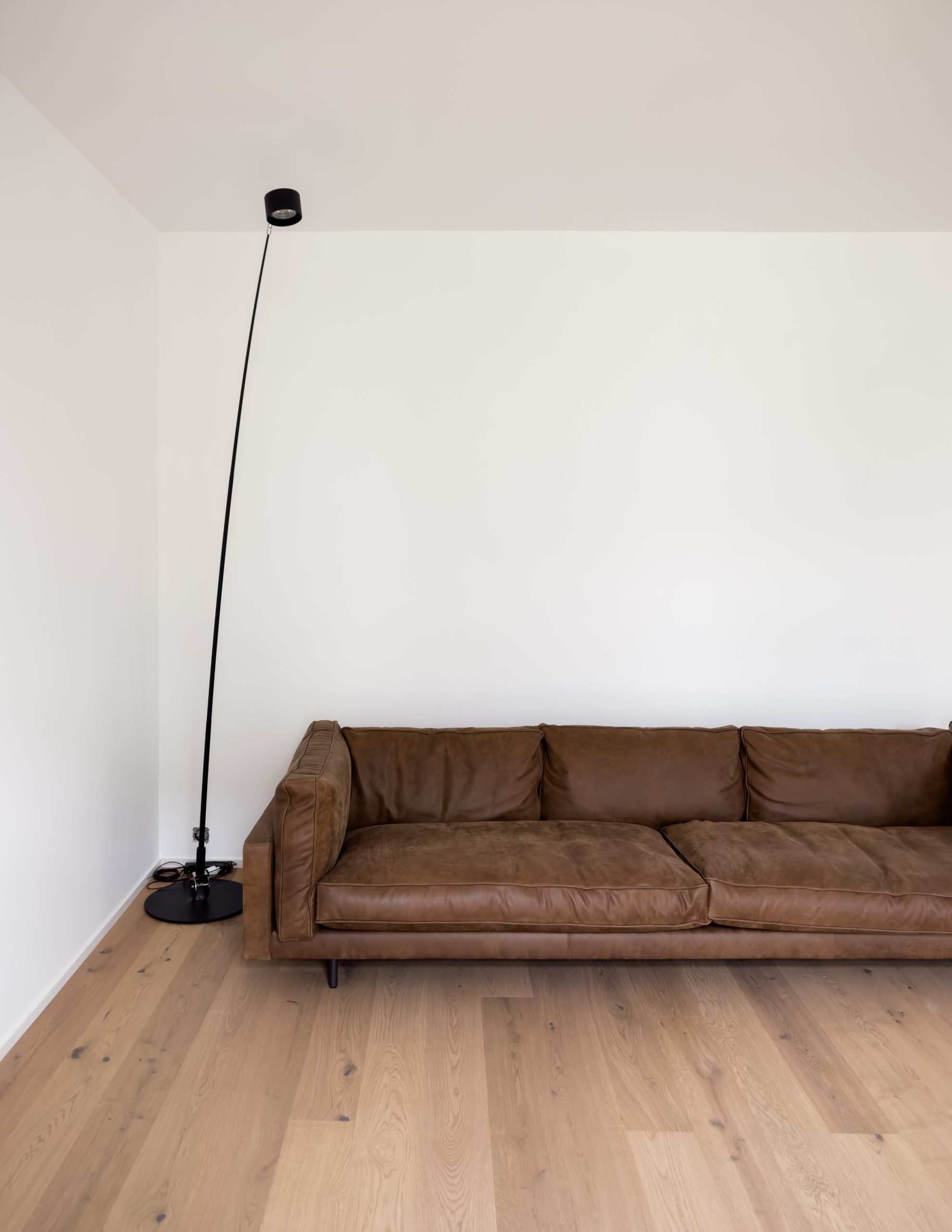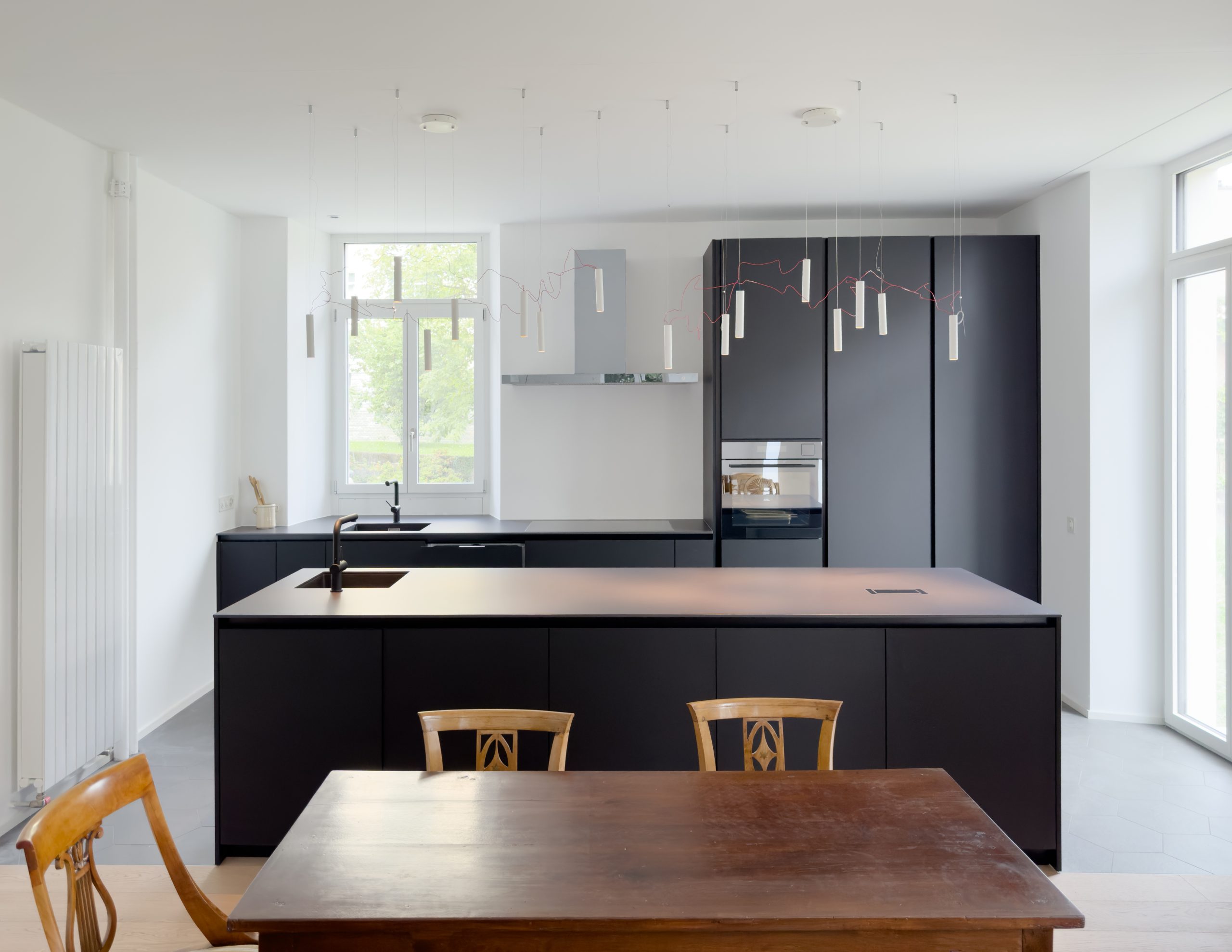 The living room windows were enlarged to provide direct access to the garden. The elevated ground-floor apartment was connected to the garden level via a new steel and granite staircase, where a generously proportioned outdoor area clad in granite extends the living space into the landscape.